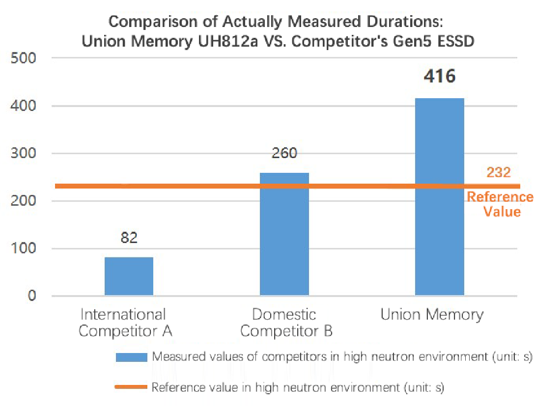 The reference value of 232 seconds is the lifespan of SSD in a high-neutron environment, which is equivalent to the 5-year lifespan of SSD in a normal environment. If, in a high-neutron environment, the actual operating time (measured value) of SSD is longer than the reference value, in indicates that it is stronger in terms of reliability and data protection capability. In this test, the actual operating time of Union Memory UH812a was 416 seconds, which was approximately 60% longer than that of domestic competitors B's similar products and approximately 400% longer than that of international competitor A's similar products. Under the simulated neutron flux conditions, the normal operating time of SSD needs to reach 232 seconds to achieve a 5-year lifespan. The average operating time of Union Memory UH812a was 79% longer than the equivalent time of the 5-year lifespan, which can clearly meet the users' requirements for the durability and reliability of SSD in a high-neutron environment.