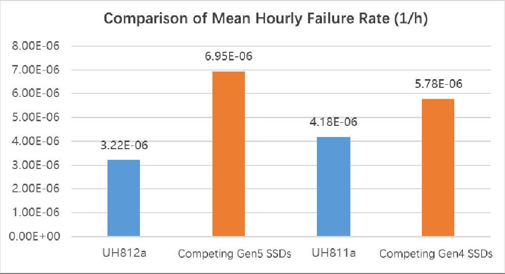 Fig. 3: Comparison of Mean Hourly Failure Rates Between UH812a and the Previous Generation Products and Competing Gen5 SSDs