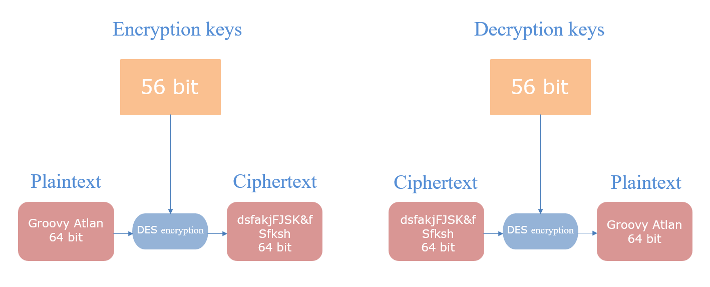 ·DES: The process is to encrypt the plaintext by DES with 64 bits as a group and then generate ciphertext. Similarly, the ciphertext is divided into groups with 64 bits each group. The consecutive groups of ciphertext can be restored to the corresponding plaintext by the decryption key.