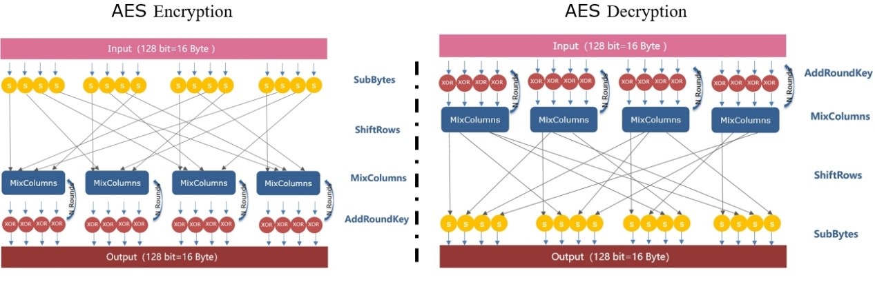 ·AES: Due to the complexity of the process, it isn't explained thoroughly here. The general process is that the input plaintext data will be replaced byte by byte. After the replacement is completed, it will be translated. After completion of the translation, it will be done with N times of hybrid column iteration. Finally, it will perform XOR operation to generate ciphertext. To decrypt, operate in reverse.