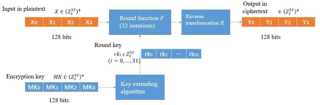 ·SM4: SM4 is a block cipher algorithm with a block length of 128 bits (16 bytes, 4 words) and a key length of 128 bits (16 bytes, 4 words). With it, the encryption and decryption process adopts a 32-round iterative mechanism (similar to DES and AES), with a round key (similar to DES and AES) and a reverse transformation for each iteration.