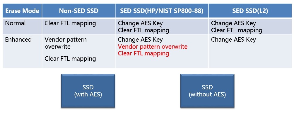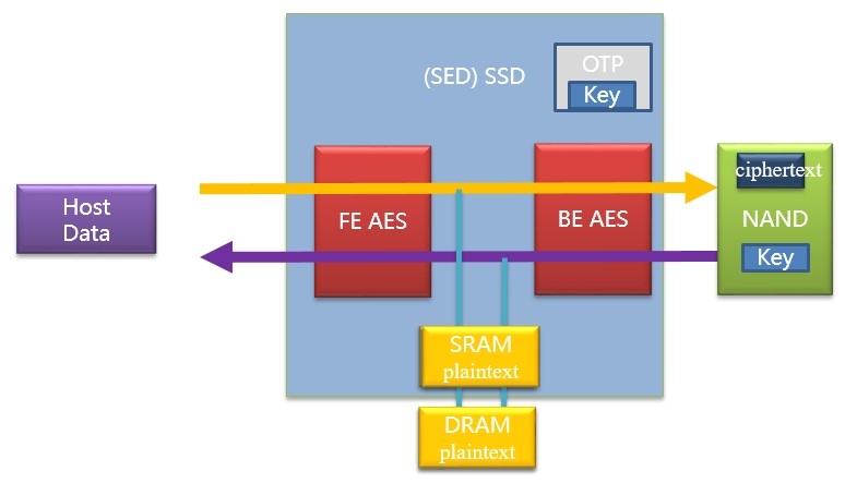 There is an AES hardware module inside the SSD for encrypting and decrypting host or internal data. Its key is managed by the firmware of the SSD and stored on NAND or the OTP area inside the SOC. As specified in IEEE 1667, the SSDs with a built-in encryption module are called SED (Self encrypting) SSD, and others as Non-SED SSDs.