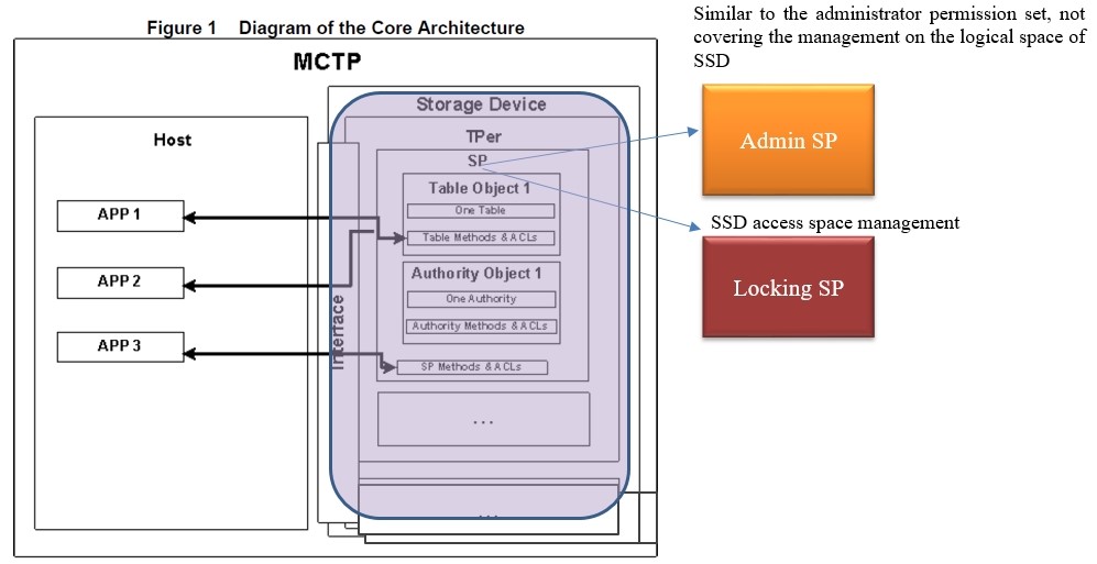 As shown in the figure, there are two SPs above the SSD: Admin SP and Locking SP. Admin SP, similar to the administrator permission set, has only some management functions. It is not used for the allocation of the SSD's logical space or for decision-making; while Locking SP is used for SSD access space management.