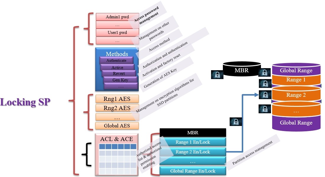 Between them, Admin SP is the most important and used for password management, enabling/disabling the Locking SP, restoring factory settings, etc. Admin SP is generally used for management of dozens of types of passwords, and does not directly manage the SSD data space.