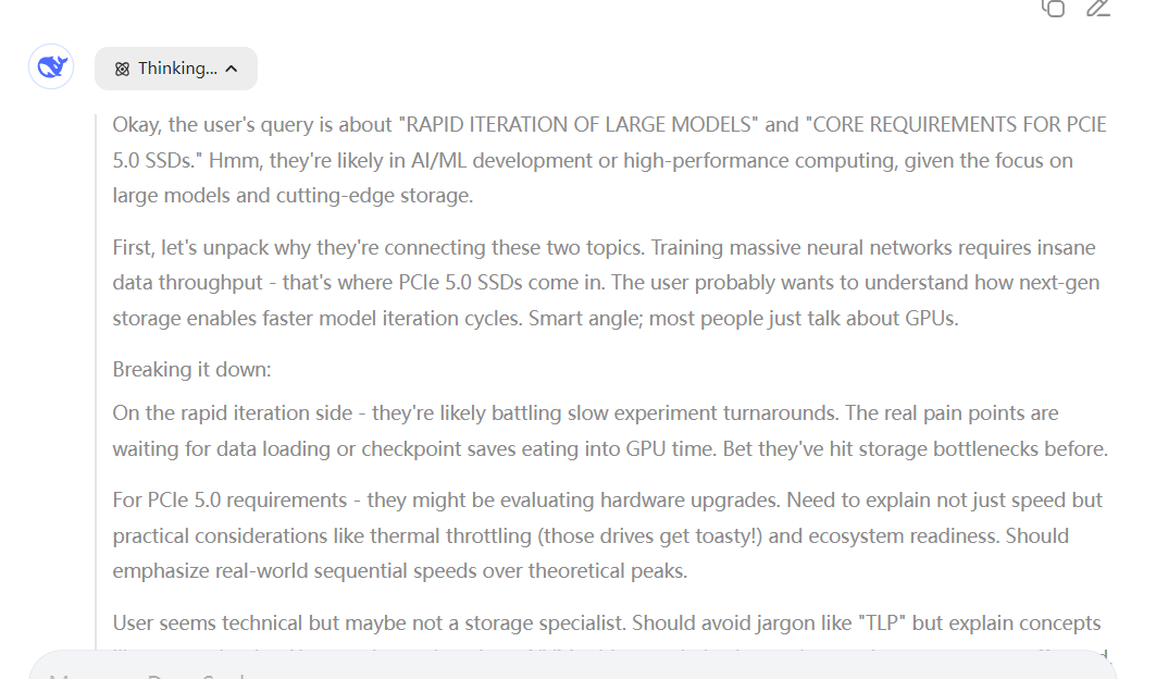 By leveraging DeepSeek's deep thinking and networked search capabilities, we entered the question “What are the core requirements for PCIe 5.0 SSD in the context of rapid iteration of large models?” into DeepSeek. Here is its response: “The rapid iteration of large models places higher demands on storage systems. In particular, as PCIe 5.0 SSD serves as the key data carrier, it needs to make comprehensive breakthroughs in multiple dimensions such as read/write performance, latency, capacity, and reliability in order to support the real-time requirements of large model training/inference.”