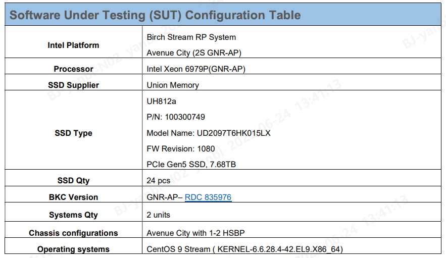 The following are the relevant configuration details of Union Memory UH812a performance test conducted on the Intel Birch Stream platform.