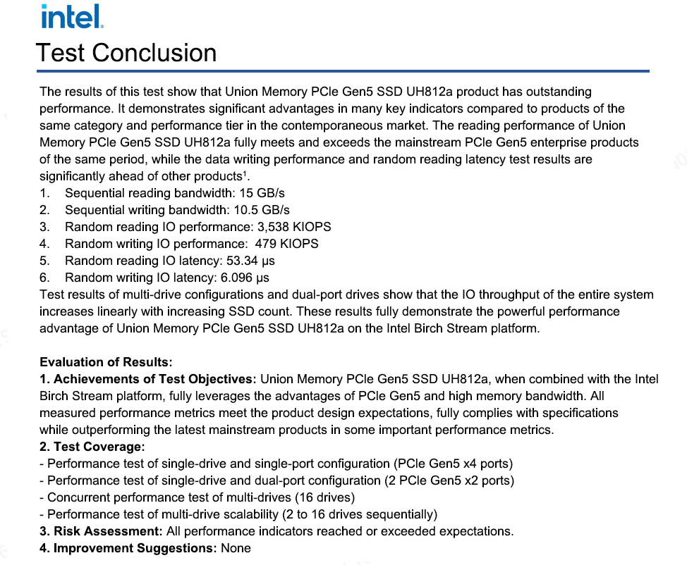 To meet the surging needs for data storage, Union Memory UH812a successfully passed the strict BKC verification and PCIe link stability test by Intel, achieving zero-defect compliance. The Benchmark performance test results are even beyond expectations. This marks another significant breakthrough in the cooperation after both sides completed the joint verification of BKC and PCIe link stability. This achievement will accelerate the upgrade and iteration of storage solutions, providing industrial customers with higher performance, stronger stability and more reliable products. In the future, Union Memory will continue to drive innovation through technology, gather advantages through ecological collaboration, and promote continuous performance breakthroughs, empowering the high-quality development of data center industries in China and globally.