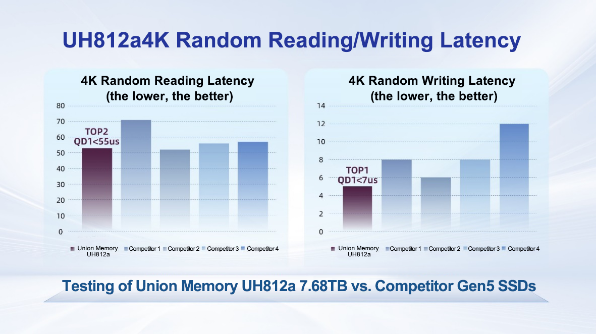 l Stable Low Latency: Union Memory UH812a is outstanding in ultra-low latency feature. The4K random reading QD1 latency is less than 55μs. Compared with that of the previous generation (PCIe 4.0 SSD), it is improved by 43%, and it is 25% better than that of international competitors. The 4K random writing performance ranks TOP1 among competitors. Whether running complex simulation programs or processing massive data sets, it can achieve microsecond-level response, laying a solid foundation for high-performance computing and data-intensive applications.