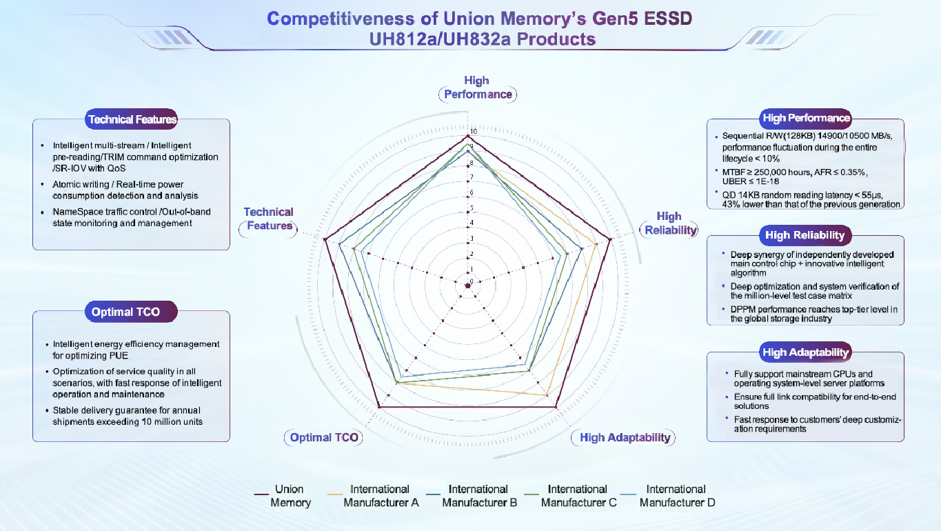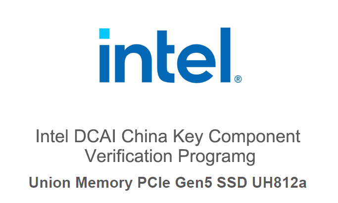 Recently, Union Memory's new generation PCIe 5.0 enterprise SSD UH812a successfully passed the performance benchmark test of the Intel's Data Center and AI Group (DCAI) at the Intel DCAI China Key Component Verification Program, becoming the first domestic storage manufacturer being successfully verified. The test results showed that UH812a significantly outperformed mainstream competitors of the same generation in key performance indicators. Its outstanding performance and stability fully unleashed the potential of the PCIe Gen5 high-speed bus and platform memory bandwidth, and meanwhile, it strongly demonstrated the successful cooperation between Union Memory and Intel in the field of data center storage.