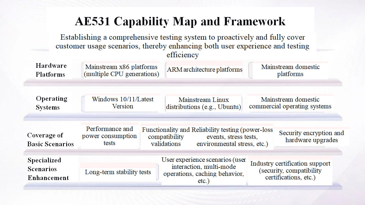 The AE531 has passed over 7,000 tests, and sets benchmarks for compatibility and reliability. The product can be widely adapted to mainstream CPU architectures and operating systems, supporting TCG OPAL 2.0 and AES-256 hardware encryption, and providing comprehensive protection for data security and privacy.