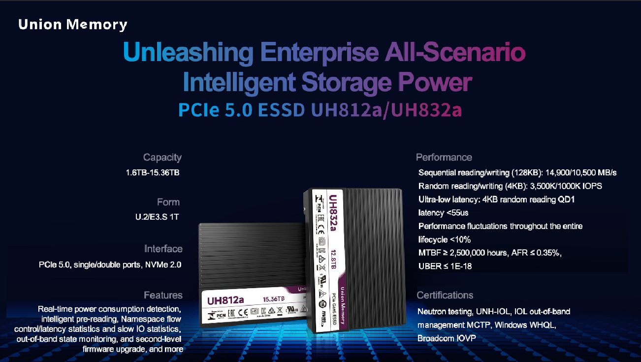 Union Memory has been deeply engaged in storage technologies for over two decades, and has established a complete matrix of enterprise-grade storage products, covering PCIe/SAS/SATA interface standards. It offers diverse product forms and flexible and customizable portfolio solutions, continuously building data storage platforms with ultimate performance for key industries such as finance, telecommunication, and government services, and empowering enterprises in their digital transformation.