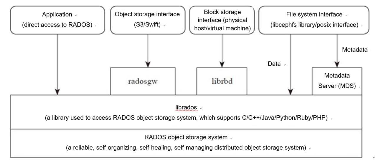 Ceph is mainly divided into the application interface layer, basic storage interface layer, and storage object layer. The interface layer is responsible for client access and is divided into local language binding interface, block storage device interface, and file system interface, demonstrating the unity of Ceph.