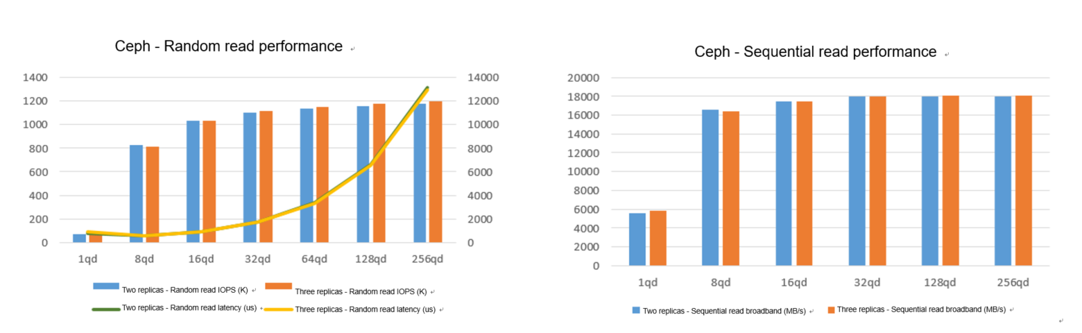 As can be seen from Figure 4, in the Ceph distributed storage system, the read performance of Union Memory's UH8 Series SSDs is basically the same for two-replica configuration and the three-replica configuration. In terms of latency, the trends of two-replica configuration and the three-replica configuration are basically the same. The latency remains relatively stable between 1QD and 32QD. However, after reaching 32QD, the latency increases significantly.