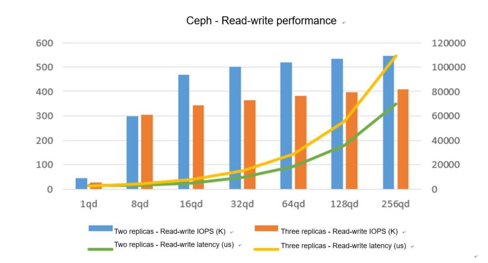 As can be seen from Figure 6, in the 4K 7:3 read-write processing scenario, the IOPS performance of two-replica configuration is better than that of three-replica configuration from 16QD onwards. In terms of overall latency performance, the two-replica configuration is lower than the three-replica configuration. However, in terms of the latency change trend, the two-replica configuration and the three-replica configuration are basically the same. The latency starts to increase significantly from 32QD.