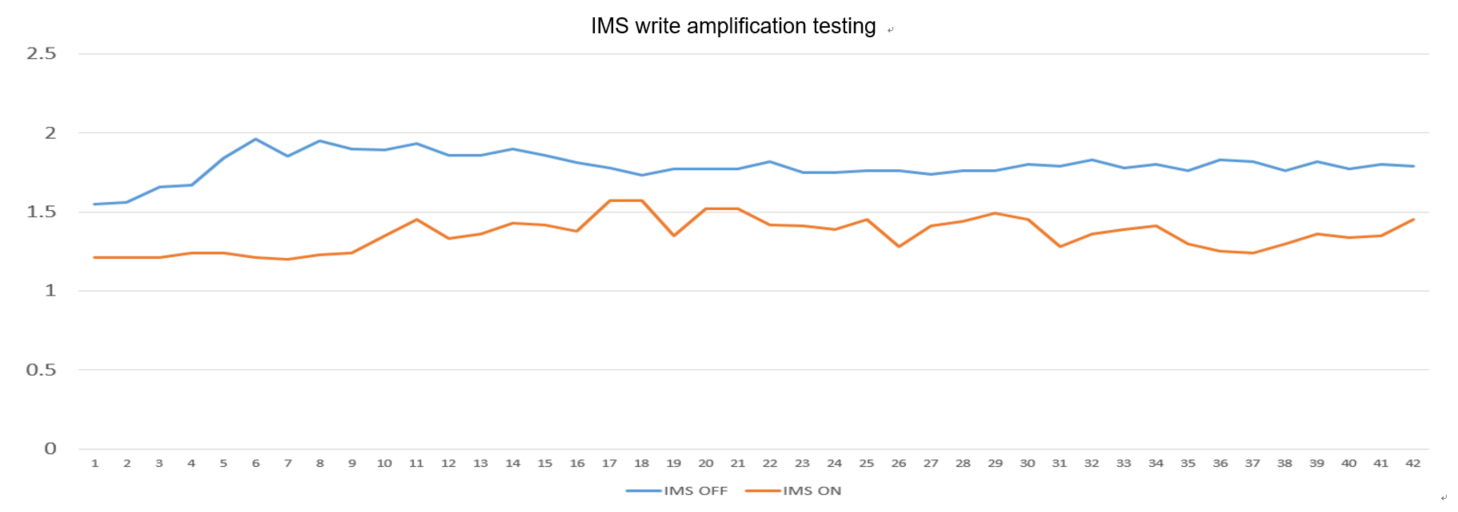 In the Ceph scenario, based on the standard JESD 219 business model, write amplification tests were conducted by enabling and disabling the intelligent multi-stream feature for SSDs. By comparing the verification results in Figure 7, it can be observed that with Union Memory's Intelligent Multi-Stream (IMS) enabled, write amplification is reduced by more than 20%, significantly improving the endurance of the SSDs.