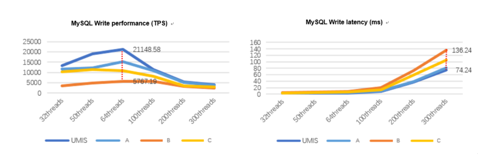 According to Figure 3, it can be seen that in terms of MySQL read performance, Union Memory's SSD performs optimally between 50 - 100 threads. Compared to the SSDs of other manufacturers, there is a maximum improvement of 122% in TPS and a maximum reduction of 91% in latency. In the MySQL read-only verification scenario, the advantages of Union Memory's SSD are obvious.