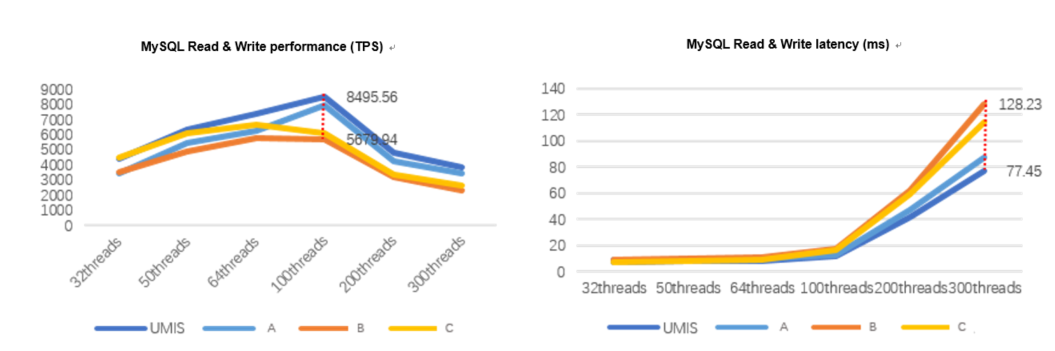 From Figure 5, it can be seen that Union Memory's SSD outperforms in MySQL read-write scenario, both in terms of throughput and latency. Compared to SSDs of other manufacturers, Union Memory's SSD shows a maximum improvement of approximately 49% in throughput and a maximum reduction of 65% in latency.