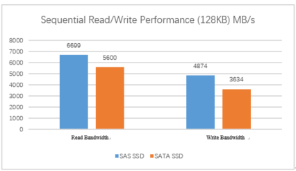 In this test, 6 SAS SSDs and 12 SATA SSDs are configured with Raid5 and Raid50, respectively. The FIO test tool is used for pressure testing of 128KB sequential read/write bandwidth performance on the Server host. As shown in Fig. 3, SAS SSDs have better read/write bandwidth. The read bandwidth is increased by about 19.6% and the write bandwidth is increased by about 34% compared with SATA, showing the absolute advantage of SAS SSDs under the Raid logical volume bandwidth.