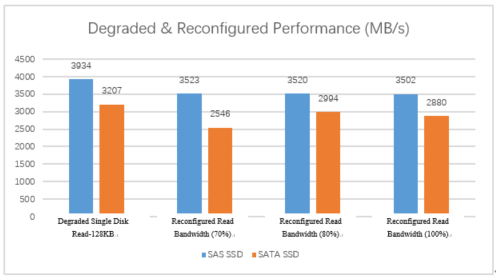 As shown in Fig. 4, SAS SSDs perform better than SATA SSDs both in the read performance of degraded single disk at fault and in the reconfigured read bandwidth. The read performance of degraded single disk at fault is about 22.7% better than that of SATA SSDs, and the reconfigured read bandwidth performance is about 38.4% higher than that of SATA SSDs.