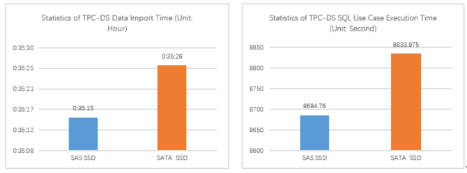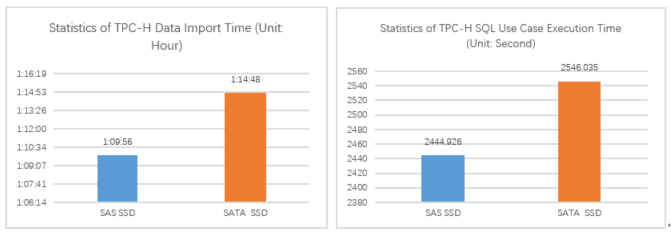 TPC-DS test is to load data to GBase database shardings via FTP protocol. As can be seen from Fig. 5, under the same physical hardware environment, Union Memory SAS SSDs take slightly less time than SATA SSDs in both data import and SQL use case execution, and the former have a certain advantage in time.